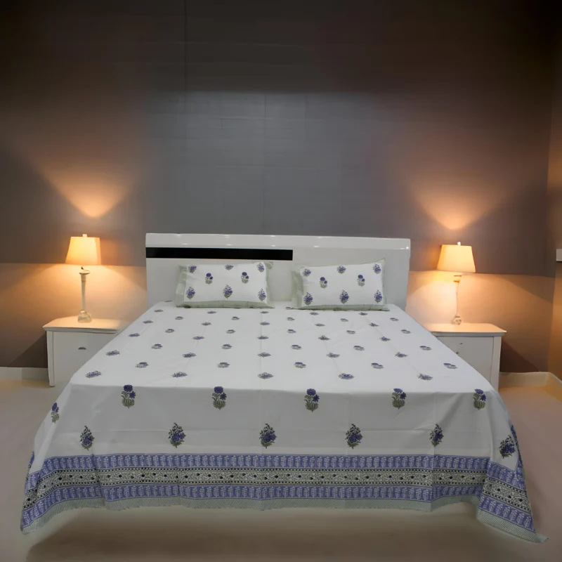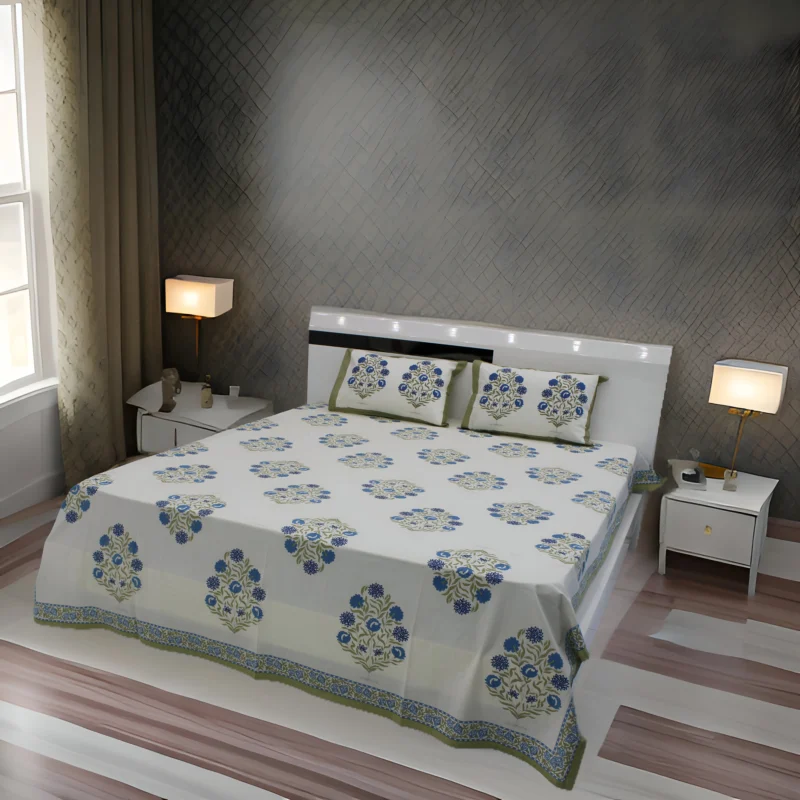 100% Cotton Hand Block Print Double Bedsheet , POPILN-BLUE 1